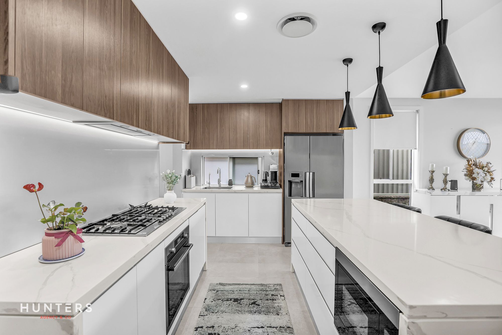 • Gourmet kitchen with 40mm Caesarstone benchtops, gas cooking, stainless steel appliances & feature lighting