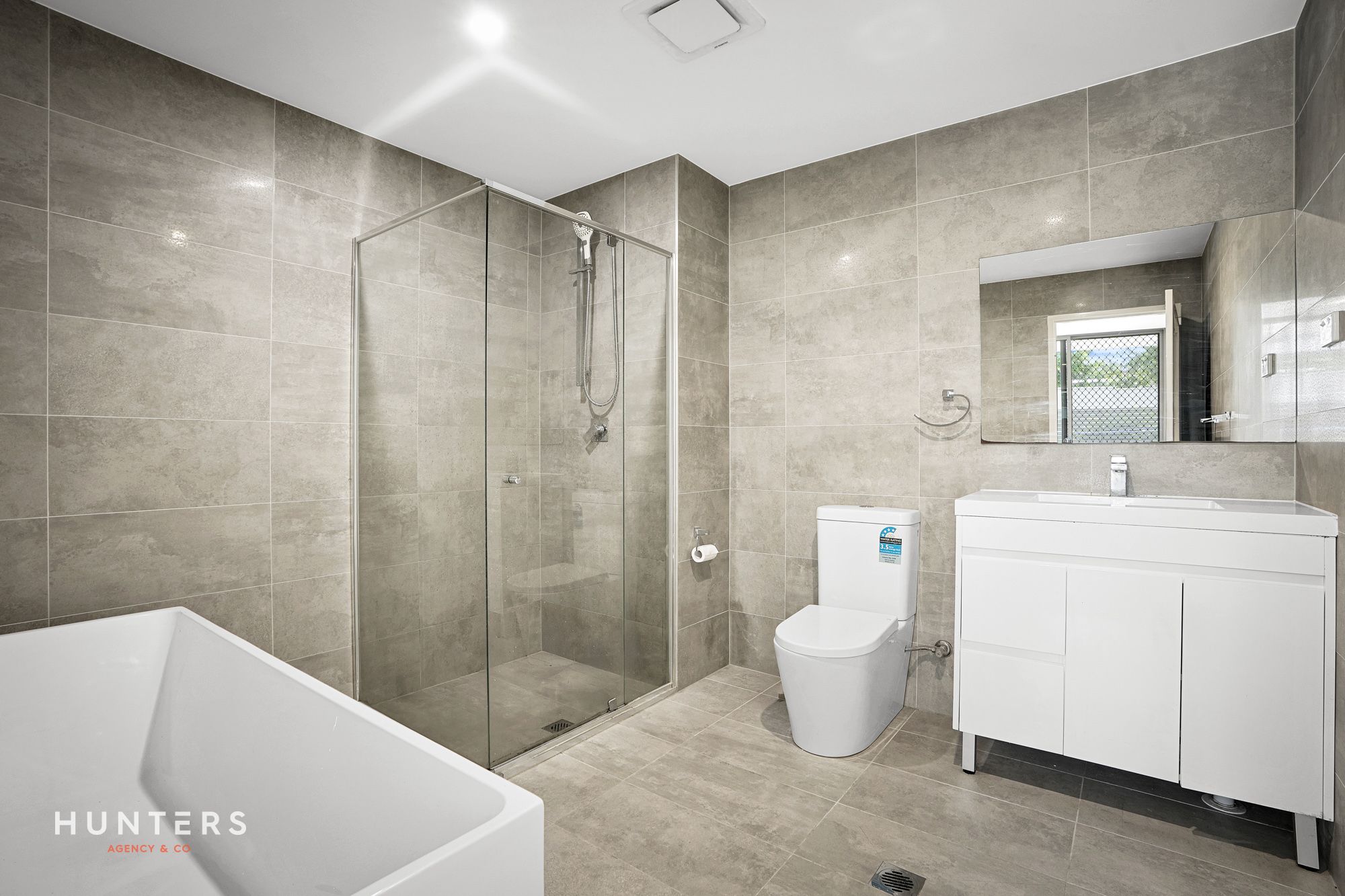 • Modern fully tiled main bathroom with a separate shower and bathtub