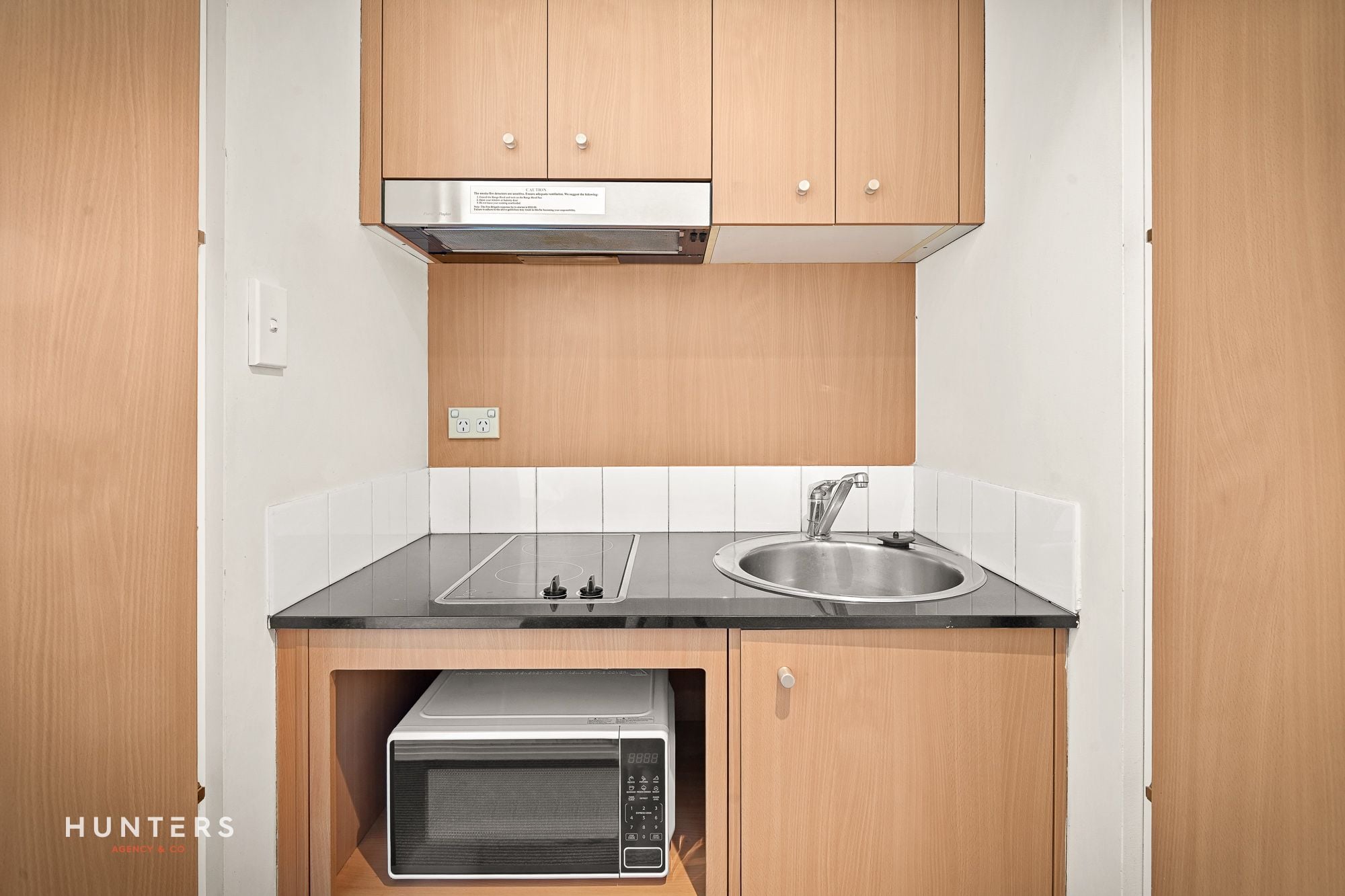 • Boutique kitchen with Electric 2 ring cooktop, microwave, dishwasher, bar fridge and ducted exhaust.