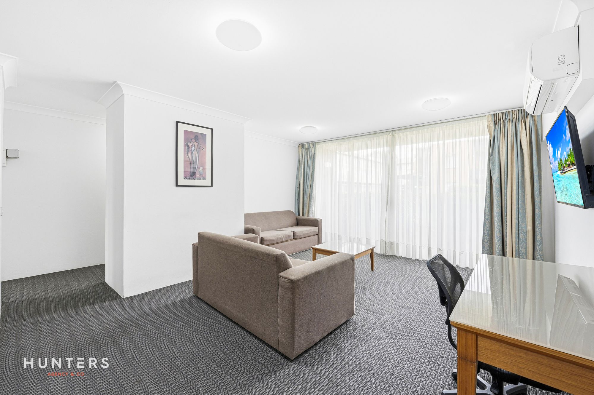 - Large combined dining and living room, fully furnished, with a split air/conditioning unit and a green outlook