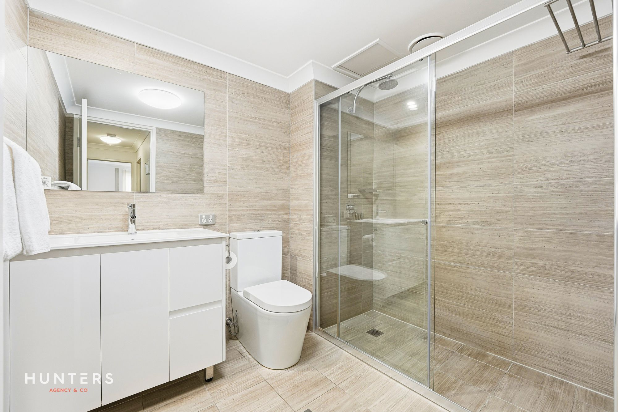 - The modern bathroom has a stand-alone shower, floor to ceiling tiles and heater lamps.
